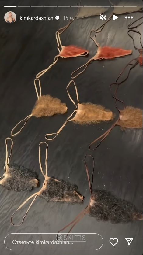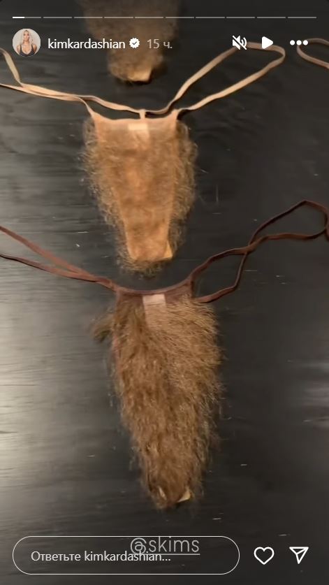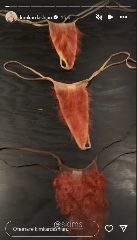 Популярна модель та американська медійна особистість Кім Кардаш’ян випустила нову лінійку епатажних трусиків від бренду Skims. Мініатюні стрінги мають на передньому шарі тканини штучне волосся, яке імітує інтимну зачіску.