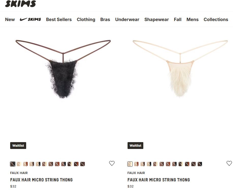 На офіційному сайті Skims придбати такі трусики можна за 32 долари, при цьому можна обрати колір тканини та колір волосся, крім того, волосся теж може бути прямим чи кучерявим.